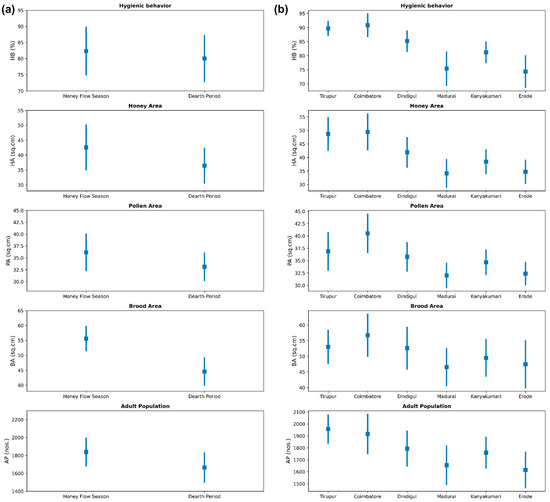 The results of the descriptive statistics for honey bee colonies across seasons (honey flow season and dearth period) (Figure 1a) and different locations (Figure 1b) revealed intriguing insights into the dynamics of hive metrics. In the honey flow season, the mean HB stood at 82.35 ± 7.39%, while the HA and PA displayed means of 42.59 ± 7.51 cm2 and 36.17 ± 3.82 cm2, respectively. The BA exhibited a mean of 55.62 ± 4.05 cm2, and the AP showcased a mean of 1838.79 ± 154.12 adults. Transitioning to the dearth period, the HB had a mean of 80.03 ± 7.12%, while the HA and pollen area PA recorded means of 36.47 ± 5.76 cm2 and 33.14 ± 2.87 cm2, respectively. The BA displayed a mean of 44.57 ± 4.52 cm2, and the AP presented a mean of 1665.32 ± 163.29 adults. These results illuminate subtle variations in hive metrics between the two seasons, with the honey flow season tending towards marginally higher mean values. On consideration of location, the results revealed that Coimbatore exhibited the highest average hygienic behavior (90.85 ± 3.67%) and high values for brood area (56.75 ± 2.33 cm2), with an adult population of 1916.77 ± 110.70. Tirupur followed closely with an average hygienic behavior of 89.71 ± 1.91% and the highest adult population (1958.22 ± 53.94). In contrast, Erode and Madurai displayed the lowest hygienic behavior averages (74.37 ± 5.53% and 75.39 ± 5.72%, respectively) and had lower values for other parameters, indicating poorer hive health. These highlights underscore the variability in hive performance, with Coimbatore and Tirupur leading in most metrics. The detailed descriptive statistics of each season and location are provided in Tables S2 and S3, respectively. To further study the season and location effects, an ANOVA was performed.