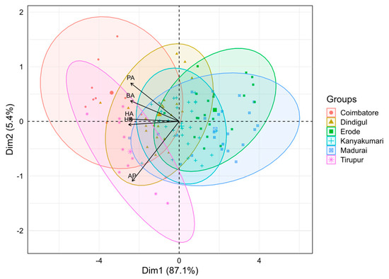 Principal Component Analysis was performed to understand the distribution and distinctiveness of locations concerning the selected characteristics of honey bee colonies for study (Figure 2). The first two PCs accounted for 92.5% of the total variability among the variables investigated. Traits such as the PA, BA, and HA had positive loadings on the PC2 and exhibited positive correlations with each other. Similarly, the traits HB and AP had negative loadings on the PC1 component and exhibited negative correlations with traits PA, BA, and HA. Groups such as Kanyakumari, Madurai, and Erode were skewed towards the positive quadrant and exhibited greater influence in the PC1. However, Coimbatore, Tirupur, and Dindigul accounted for much variability in the PC2. From the analysis, it was observed that Tirupur and Coimbatore colonies were distinctly distributed and placed distant from the origin, which implies that these groups had significant variations explained by the original variables. Vectors represent the component loadings of the original variables. All five vectors (HB, HA, PA, BA, and AP) were almost equal in length, denoting their more or less equal contribution in explaining the variance. From the direction of the vectors, it was understood that Tirupur colonies could be characterized by higher values of AP, HB, HA, and PA, while HB, HA, BA, and PA were strongly associated with Coimbatore. As far as other locations are concerned, variation among the groups seemed to be less, as huge significant overlaps were found. Particularly, Dindigul and Kanyakumari colonies were clustered around the origin, showing very low variance among the original variables.