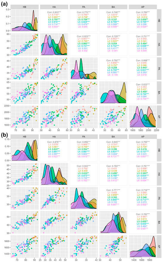 Correlation analysis of colony traits (a) honey flow season and (b) dearth period. Note: L1—Tirupur, L2—Coimbatore, L3—Dindigul, L4—Madurai, L5—Kanyakumari, and L6—Erode. The significance levels are represented by ‘*’ (p < 0.05), ‘**’ (p < 0.01) and ‘***’ (p < 0.001).