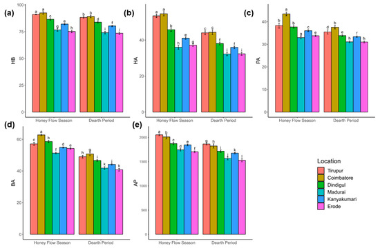 Pairwise mean comparison among characters. The figure shows the average levels of five characters, (a) hygienic behavior, (b) honey area, (c) pollen area, (d) brood area, and (e) adult population, measured from six locations (Tirupur, Coimbatore, Dindigul, Madurai, Kanyakumari, and Erode) during two distinct periods (honey flow season and dearth period) using bar graphs. The average Cohen’s d effect size was used to quantify the difference between groups and is represented by alphabetic letters. Groups with the same alphabetic letter indicate that differences between those groups are not significant.