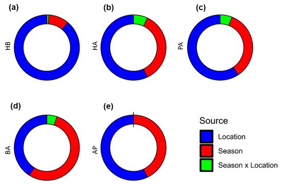 Effect sizes of main and interaction effects of parameters on different characters. The figure shows the relative importance of the main (season and location) effects and interaction (season × location) effects of the factors on five characters: (a) hygienic behavior, (b) honey area, (c) pollen area, (d) brood area, and (e) adult population, using doughnut diagrams.