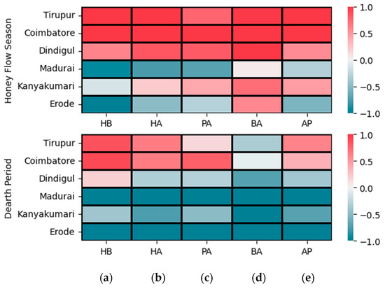 Degree of performance of honey bee colonies. Cohen’s d statistic computed for pairwise mean comparison was summed across interactions and averaged to study the performance of colonies across six locations (Tirupur, Coimbatore, Dindigul, Madurai, Kanyakumari, and Erode) and two seasons (honey flow season and dearth period) measured by five different characters, (a) hygienic behavior, (b) honey area, (c) pollen area, (d) brood area, and (e) adult population, using a heat map. The color gradient from red to blue indicates the range of effect sizes from 1.0 to −1.0. The red color gradient indicates higher effect sizes, while the blue color gradient depicts the least effect sizes. White color represents non-significant effect sizes.