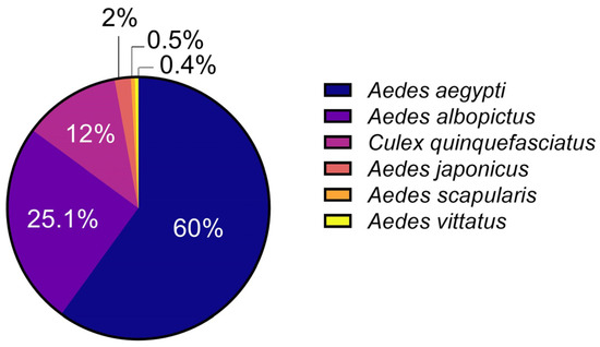 Among the principal genera currently involved in disease transmission are Aedes, Culex, Culiseta, Sabethes, Haemagogus, and Anopheles [3]. Two of the world’s most widely distributed and medically important vectors belong to the Aedes genus and are the well-known Aedes aegypti (Linnaeus) and Aedes albopictus (Skuse) [4]. They are present mainly in tropical and subtropical regions, where they are the primary vectors of dengue (DENV), Zika (ZIKV), yellow fever (YFV), and chikungunya virus (CHIKV) [5]. Other aedine mosquitoes have been implicated in arbovirus transmissions, such as Aedes (Ochlerotatus) scapularis (Rondani), Aedes japonicus (Theobald), and Aedes vittatus (Bigot) [6,7,8,9,10,11,12,13,14,15]. In the genus Culex, the mosquitoes of the pipiens complex, Culex pipiens (Linnaeus), Cx. quinquefasciatus (Say), and Culex tarsalis are also among the most prominent vectors, transmitting a range of pathogens, including West Nile virus (WNV), avian malaria parasites, and the filarial worm Wuchereria bancrofti [16,17,18]. Among the Anopheles mosquitoes, about 60 known species within this genus are vectors of malaria parasites. Among important anopheline vectors, Anopheles gambiae (Giles) is considered one of the most epidemiologically important species in sub-Saharan Africa, along with Anopheles arabiensis, Anopheles coluzii, and Anopheles stephensi (Liston), the latter being a primary vector in urban India, initially confined to countries in South Asia and parts of the Arabian Peninsula, and now having recently invaded Africa, causing significant concern [18,19,20].