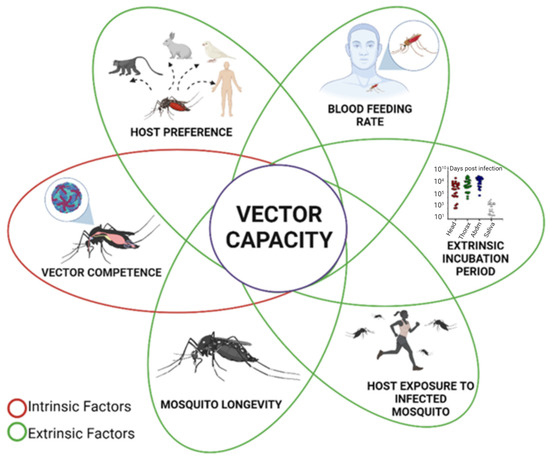 The relationship between pathogens and hosts is complex and dependent on intrinsic and extrinsic factors that determine overall vectorial capacity (Figure 2), defined as the number of new infections that result per starting infection [33]. Extrinsic factors are related to environmental factors, density and the abundance of the mosquito and its host, and the frequency of mosquito–host contact. Intrinsic factors are related to immunity, virus replication in mosquito tissues, longevity, hematophagy preferences for their host, and the timing of blood feeding whenever these factors have a genetic basis (Figure 2) [34].