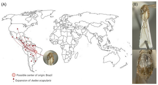 Aedes scapularis expansion and morphological characteristics. (A) The red dot represents the possible center of origin (Brazil), and the dotted red arrows show the countries where Ae. scapularis has been found. (B) Top: lateral full-body view. Botton: thorax depicting a large patch of silver scales. Specimens were collected near Belem, Para, Brazil, and adapted from [43]. Images of the Ae. scapularis were provided by the Walter Reed Biosystems Unit (WRBU) and the Smithsonian Institution and reproduced with permission from Dr. Yvonne Linton.