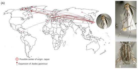 Aedes japonicus japonicus expansion and morphological characteristics. (A) The red dot represents the possible center of origin (Japan), and the dotted red arrows show the countries where Ae. j. japonicus has been found. (B) Top: lateral full-body view. Botton: thorax depicting the bronze-colored lyre-shaped scales. Specimen collected in Tokyo, Honshu, Japan. Deposited at the Natural History Museum, London, England, United Kingdom (NHMUK); pictures were adapted from [74]. Images of the Ae. j. japonicus were provided by the Walter Reed Biosystems Unit (WRBU) and the Smithsonian Institution and reproduced with permission from Dr. Yvonne Linton.