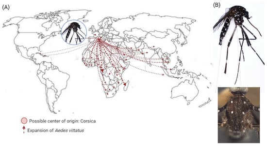 Aedes vittatus expansion and morphological characteristics. (A) The red dot represents the possible center of origin (Corsica, France), and the dotted red arrows show the countries where Ae. vittatus has been found. (B) Top: lateral full-body view. Botton: thorax depicts three pairs of round, silvery white spots. Specimens were collected in Cuba in a CO2-baited CDC light trap at Naval Station Guantanamo Bay on 18 June 2019, and pictures were adapted from [87,89]. Images of the Ae. vittatus were provided by the Walter Reed Biosystems Unit (WRBU) and the Smithsonian Institution and reproduced with permission from Dr. Yvonne Linton.