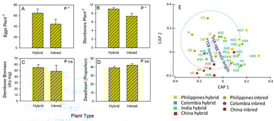 4.2. Stemborer Responses to Hybrid and Inbred Genotypes