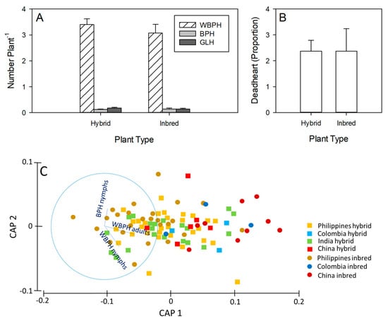 - Horgan, F.G.; Bernal, C.C.; Ramal, A.F.; Almazan, M.L.P.; Mundaca, E.A.; Crisol-Martínez, E. Heterosis for resistance to insect herbivores in a 3-line hybrid rice system. Insects 2024, 15, 164. [Google Scholar] [CrossRef]