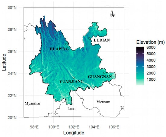 Map of four monitor sites in Yunnan Province. We used the “geodata” package [31,32] to download global elevation data and the R package “ggplot2” [33] to draw the elevation map.
