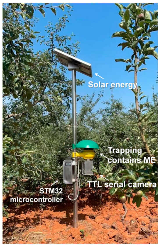 The monitoring system, powered by solar energy with a system voltage of 12 V. Methyl eugenol (ME, produced by Guangzhou Ruifeng Biotechnology Co., Ltd. (Guangzhou, China)) was replenished monthly in the device since it is a volatile compound. The monitoring system uses a TTL serial camera with a resolution range of 200–1200 W. The imaging process is based on an STM32 microcontroller software (RF-XY-V2.0) control system. The recognition process is based on the Visual Transformer, which serves as the backbone network for the recognition method. This configuration guarantees the integrity and accuracy of data acquisition within the monitoring system. The Internet of Things technology empowers the system to interconnect sensors and devices implanted in an orchard environment to the internet, facilitating the real-time collection and transmission of data to distant servers or monitoring hubs. This configuration permits researchers or operators to retrieve the data from any location through the network, facilitating real-time surveillance of pest activities within the orchard.