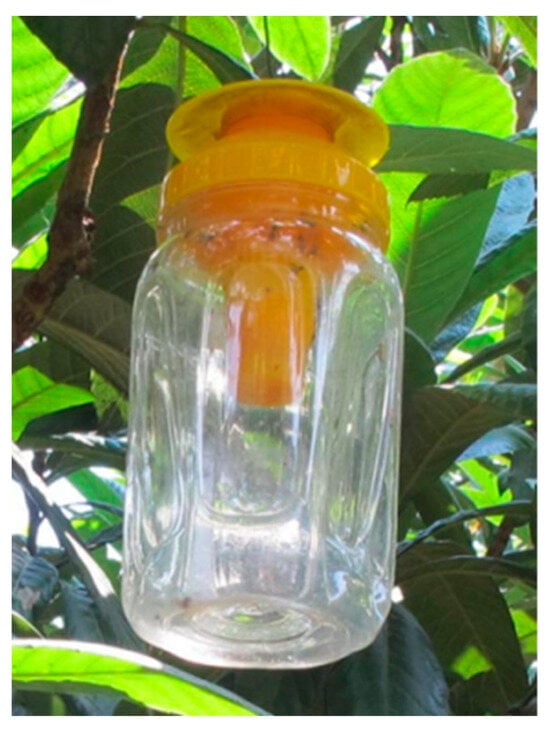 Although the electronic monitoring system is already a commercially available product, its reliability was assessed in Yuanjiang County from 21 March to 18 April 2017. An electronic monitoring system and three bottle traps (Figure 3) were set up in a mango orchard at an altitude of 420 m and a peach orchard at an altitude of 1600 m. Daily counts of trapped flies were conducted. The monitoring system and the bottle traps were placed 50 m apart, arranged in a square configuration. This setup allowed for a comparative analysis of the electronic system’s effectiveness against traditional trapping methods.