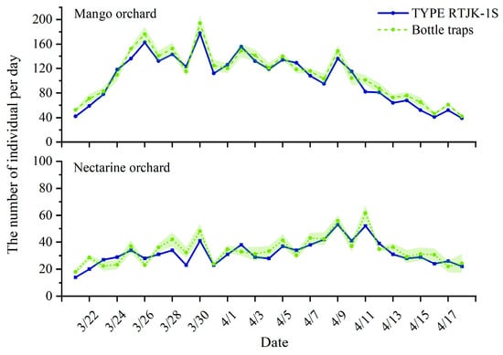 In the surveillance conducted from March to April 2017 across two orchards, the trends in the adult population dynamics of B. dorsalis, as detected by both the automatic monitoring system and manual monitoring, were found to be congruent (Figure 4). Pearson’s correlation analysis of the daily monitored counts of B. dorsalis demonstrated a strong and significant linear correlation between the insect quantities recorded by the two monitoring approaches (Figure 5), suggesting that there is no significant difference between the automated monitoring results by the device and manual monitoring.