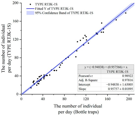 The population dynamics of B. dorsalis, as observed through manual and electronic monitoring systems, were analyzed using Origin 2021 software [34]. Additionally, a linear correlation analysis was conducted to compare the results from both monitoring methods. The “Simple Fit” tool in Origin 2021 was used for this analysis and for visualizing the outcomes.