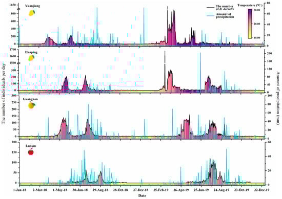 We downloaded the data for each monitoring site from the online digital plant protection big data platform of Guangzhou Ruifeng Biotechnology Co., Ltd. (Guangzhou, China). Meteorological data, including daily low and high temperatures, precipitation, wind speed, and humidity, were downloaded from the China Meteorological Data Network (https://data.cma.cn/ (accessed on 23 July 2024)). The number of individuals collected per day was plotted along with the mean daily temperature and daily total precipitation using Origin 2021. We also visualized temperature and insect counts to determine the temperature range where B. dorsalis activity peaks.