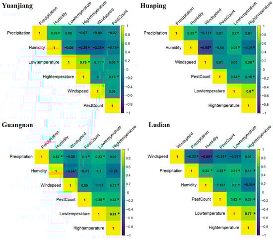 Correlation between the population of B. dorsalis and meteorological factors in four counties in 2018–2019. To investigate the relationship between the population of B. dorsalis (PestCount) and meteorological factors in four counties during 2018–2019, Pearson’s correlation analysis was employed. A Bonferroni correction was applied to account for multiple comparisons, resulting in a corrected significance level of p < 0.0033. Significant correlations are indicated by an asterisk (‘*’).