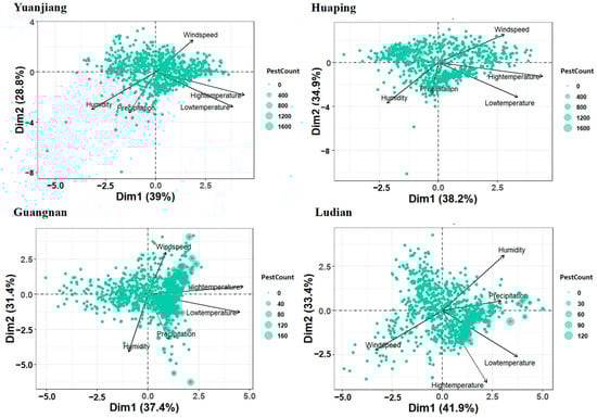Correlated weather parameters were grouped into the smallest possible subsets, representing the maximum variation in the original data set, which was conducted by performing principal component analysis (PCA) using 5 variables (Table 1). The analysis reduced these variables to two principal components with eigenvalues greater than 1, explaining 67.8% (Yuanjiang), 73.1% (Huaping), 68.8% (Guangnan), and 75.3% (Ludian) of the total cumulative variance for the entire set of variables (Figure 8). The first component (PC1) exhibits higher factor loadings for low temperature and high temperature in Yuanjiang, Huaping, and Guangnan. In contrast, in Ludian, PC1 demonstrates higher factor loadings for low temperature and wind speed. The second principal component (PC2) displayed varying leading factors across different regions: precipitation and wind speed had higher factor loadings in Yuanjiang, Huaping, and Guangnan, whereas high temperature and humidity were more influential in Ludian County.
