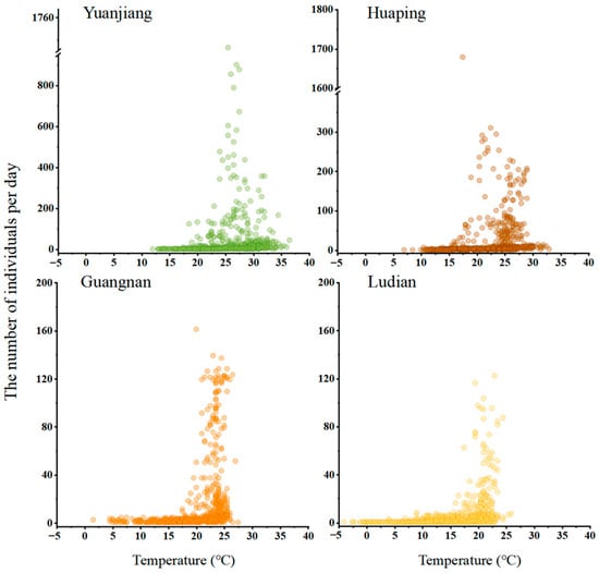 Given the seasonal patterns in the occurrence of Bactrocera dorsalis and the identification of temperature as the variable with the highest explained variance through PCA analysis, it was important to determine the temperature thresholds for the initiation of activity and the temperature ranges associated with peak occurrences of adult B. dorsalis in each county. In Yuanjiang and Huaping, the population of B. dorsalis initially increased and then decreased as the daily average temperature rose. In Yuanjiang, B. dorsalis appeared when the temperature reached 18 °C, with numbers exceeding 200 between 24 °C and 32 °C. The population peaked at 25.5 °C and then declined as temperatures continued to rise, remaining low between 33 °C and 36.5 °C (Figure 9). In Huaping, B. dorsalis appeared at 15.5 °C, with higher numbers observed between 19 °C and 29 °C. The population decreased after 29 °C and remained low up to 33 °C. In contrast, in Guangnan and Ludian, the number of B. dorsalis populations increased with rising temperature. Bactrocera dorsalis appeared at 17.5 °C and was most active between 20 °C and 25 °C in these two counties.