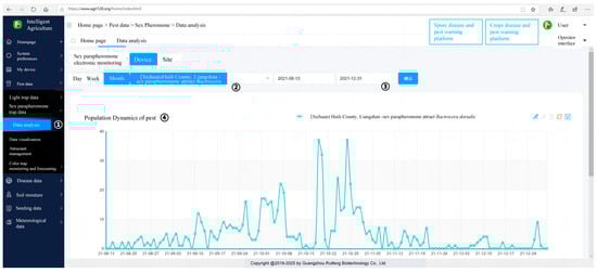 The intelligent agriculture platform, originally in Chinese, provides a computer interface to receive monitoring data. On this webpage, users can locate monitoring devices in the left-hand column. For example, to use data from a sex parapheromone monitoring device, one can select “Sex parapheromone trap data” ①. Next, users can choose the device location ② and the monitoring time period ③. Once these selections are made, the population dynamics of the monitored pests will be displayed on the page ④.