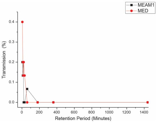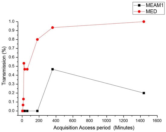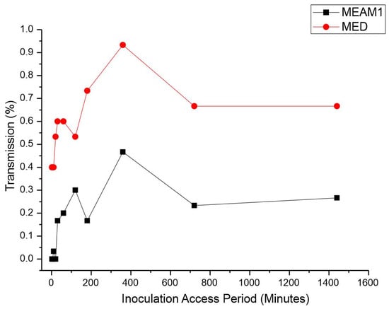 Inoculation access period (IAP). The IAP was significantly different between the MEAM1 and MED adults according to the Mann–Whitney test p-value < 0.00001 at a significance level of 0.05 (adjusted for ties). The average retention period (RP) of CPMMV by the MEAM1 and MED adults is listed in Table 2. Single viruliferous MED was able to efficiently transmit CPMMV in the minimum assessed IAP. The efficient transmission of 40% by MED occurred within just 2 min of the IAP (Figure 2). The highest transmission rate by MED, 93.3%, was observed with an IAP of 6 h. Coincidentally, MEAM1 also reached its peak transmission rate of 46.6% with an IAP of 6 h. Differently from MED, MEAM1 was able to transmit significantly at a low rate of 30% after 2 h of the IAP.