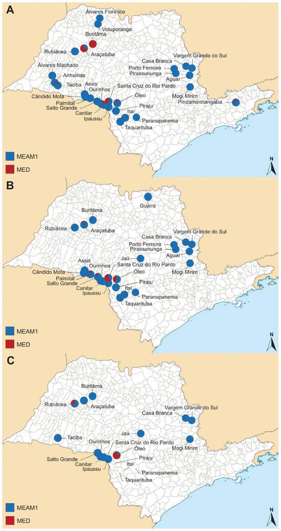 A total of 67 collections were conducted over the three soybean seasons: 2019/2020, 2020/2021, and 2021/2022. Details regarding the collection sites, the times of collection, and the geographical coordinates of each sample are summarized in Table 4. In general, a predominance of MEAM1 species was observed across almost all the sampling sites (Table 4, Figure 4). For the first soybean summer season surveyed (2019/2020), 28 sites were sampled, and MED was found in a single infestation in one site (Buritãma), and co-occurred with MEAM1 in six other locations (Araçatuba, Canitar, Óleo, Pindamonhangaba, Santa Cruz do Rio Pardo, and Taciba) (Figure 4A). In the second soybean summer season (2020/2021), MED was found co-occurring with MEAM1 in six out of twenty-four sites collected (Araçatuba, Buritãma, Óleo, Palmital, Salto Grande, and Santa Cruz do Rio Pardo) (Figure 4B). For the last season surveyed (2021/2022), the number of visited sites was reduced to 19 areas, and B. tabaci was found in 15 of them. No whiteflies could be collected from four sites because no insects were found infesting soybean (Itaí, Piraju, Santa Cruz do Rio Pardo, and Taquarituba) probably due to the rainy weather. MED was found co-occurring with MEAM1 in three of these sites (Óleo, Paranapenema, and Rubiácea) (Figure 4C).