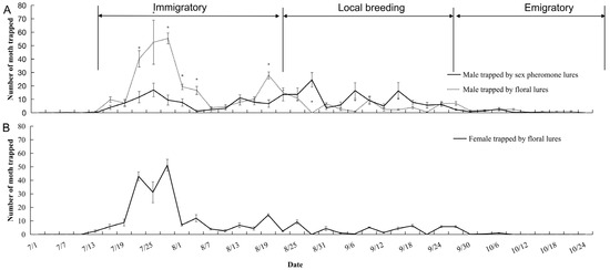 Seasonal population dynamics and migration status of C. medinalis derived from floral odor and sex pheromone trapping: (A) males trapped by the sex pheromone and floral odor; (B) females trapped by the floral odor. * Indicates statistically significant difference between treatments in the same sampling date (p < 0.05).