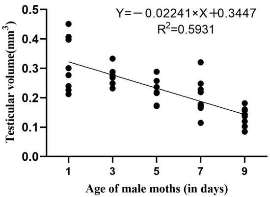 The average volume of testes in the 1-, 3-, 5-, 7-, and 9-day-old C. medinalis male moths was 0.32 ± 0.03, 0.27 ± 0.01, 0.22 ± 0.01, 0.20 ± 0.02, and 0.14 ± 0.01 mm3, respectively. Testes volume and age were negatively linearly correlated (R = −0.7713, p < 0.01) (Figure 3).