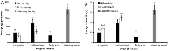 C. medinalis oviposition and egg hatchability in different migration statuses: (A) eggs oviposited by the females; (B) egg hatchability. Bars in the same figure with different letters are significantly different at p < 0.05.