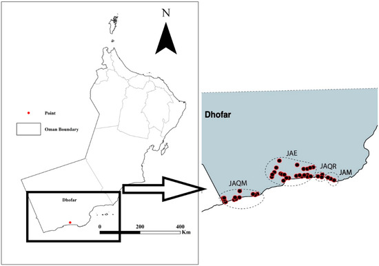 Map showing sampled localities (red dots) across Dhofar region in southern Oman: (JAQM) Jabal Qamar, (JAE) Jabal Eitin, (JAQR) Jabal Qara, and (JAM) Jabal Murbat (see Table S1).