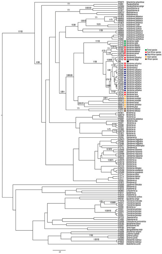 The tree topology and support values of the phylogeny estimates using RY coding were very different, with inaccurate grouping of lineages with similar base frequencies (e.g., Beast retrieved both genus Macrotermes and Odontotermes as non-monophyletic) (Figure 3) and posterior probabilities’ support values (e.g., the posterior probabilities for most groups were very low, at < 0.95, compared with the COI tree analysis without RY coding).