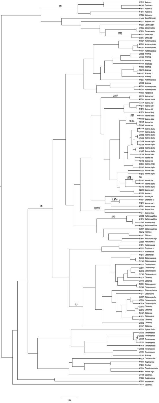 Macrotermes formed a monophyletic group in all analyses. but with little support (Figure 2). The three African forest species (M. muelleri, M. nobilis, and M. lilljeborgi) clustered together with strong support (PP = 1.00; BS = 100). The African species M. natalensis, M. jeanneli, M. subhyalinus, M. falciger, and M. herus formed a second well-supported clade (PP = 1.00; BS = 0.99) (Figure 2), whereas the Asian species (M. ahmadi, M. annandalei, M. barneyi, M. glivus, and M. carbonarius) formed a clade in the MrBayes analysis, but it was not well-supported (BS < 0.95). The two haplotypes of the African species M. bellicosus clustered together with strong support in the MP analyses but not in the Bayesian analysis (PP = 1.00; BS < 0.95).