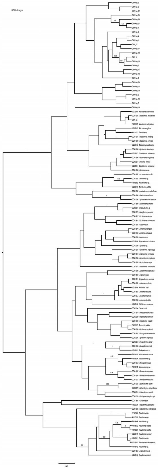 Phylogenetic placement of the Omani Macrotermes populations and its relationship to other related fungus-gardening termite, including Genbank specimens based on Bayesian analysis of 28S D3–D5 region of Arthropods. Posterior probabilities are shown above internodes. Scale bar: 0.003 bp.