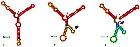 Minimum Free Energy (MFE) structure for the homozygous haplotype C4, drawing encoding base-pair probabilities. (a) C4 haplotype formed similar helix length and loops to the structural elements of Arthropods. (b) Minimum Free Energy (MFE) structure for the homozygous haplotype K4, drawing encoding base-pair probabilities, black arrow point to the changes in loops structure and variability in helix length compared to 2a. (c) Minimum Free Energy (MFE) structure for the homozygous haplotype A1, drawing encoding base-pair probabilities, black arrow point to the changes in loops structure and variability in helix length compared to 2a.
