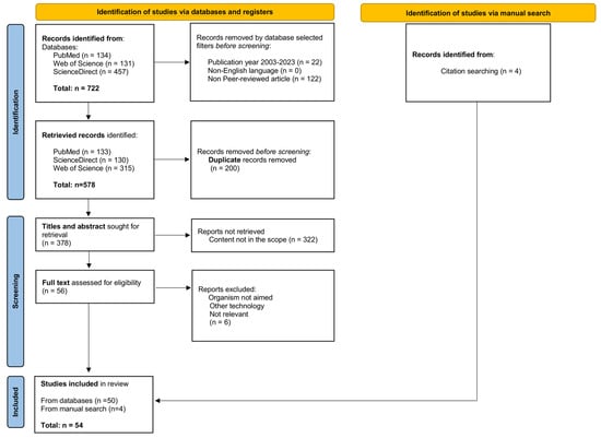 Following the PRISMA methodology, the initial screening process for articles to be included in this study was performed as mentioned above. Additional filters were applied, including the publication year, language, and type of article. Duplicate records were then manually excluded, and the remaining articles were screened based on their titles and abstracts to evaluate whether the subject specifically related to the use of MALDI-TOF MS, mosquito and life traits, and/or mosquito control/monitoring/surveillance. The full text of the selected articles was retrieved for further analysis. Other relevant articles that were not retrieved from the databases or those published after the date of the initial search (i.e., between March 2023 and August 2024) were included manually to generate the most up-to-date review.