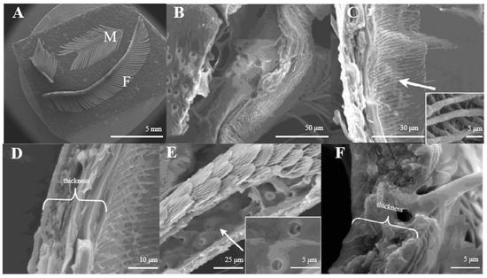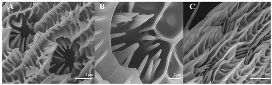 The principal axis of the antenna looks like a pipeline (Figure 1B) inner structure with a reticular (Figure 1C). On average, the axis wall is about 10.5–10.8 μm in thickness (Figure 1D). The antennal branches are tubular (Figure 1E), too. The difference between the antennal axis and antennal branches is that the inner structure of the axis is reticular, while those of the antennal branches are smooth with small pores (Figure 1C,E). The wall of antennal branches is 8.2–8.3 μm in thickness (Figure 1F).
