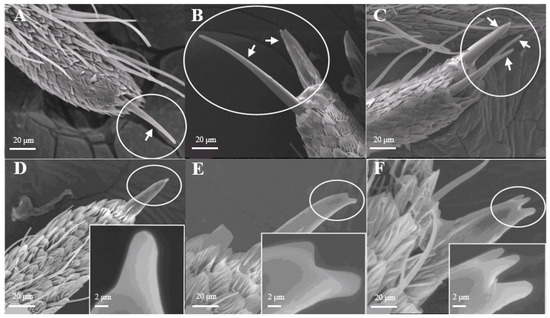 Morphology of sensilla chaetica in D. superans. (A–C) s. chaetica on the tip of antennal branch (×1000); (D–F) the spike (spine) of s. chaetica (×1000, ×10,000).