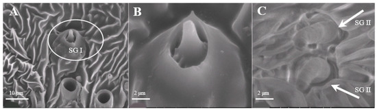 Morphology of sensilla coeloconica in L. dispar. (A) s. coeloconica of males (×5000); (B) s. coeloconica of females (×10,000); (C) s. coeloconica of females are clustering (×5000).