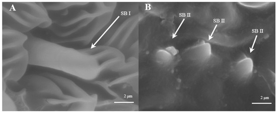 Sensilla basiconica are located on the reverse side of the principal antennal axis and look like small stingers. They are shorter and more erect than s. trichoidea. The number of s. basiconica is about 2834 ± 157 on the principal antennal axis, which is almost equal to the number of s. trichoideas on four branches. s. basiconica can be divided into two sub-types by their length: s. basiconica I (Figure 6A), which are 3.5–3.6 μm in length, and s. basiconica II (Figure 6B), which are 1.3–1.4 μm in length.