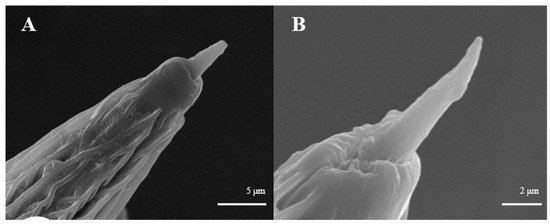 Morphology of sensilla styloconica in L. dispar. (A) s. styloconica of males (×5000); (B) s. styloconica of females (×10,000).