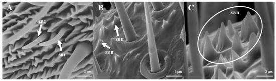 Sensilla basiconica can be divided into two sub-types by their length. s. basiconica I (Figure 12A), about 9.3–9.4 μm in length, are located on the reverse side of principal antennal axis, while s. basiconic II (Figure 12B,C), about 2.0–2.2 μm long, are distributed mainly at base of flagellum in both sexes and are scattered under s. chaetica II. Three antennas of the female are randomly selected, and the average number of s. basiconica I and s. trichoidea II on each branch is 76 ± 13 and 231 ± 28, respectively. The overall number of s. basiconica I is less than that of s. basiconica II.