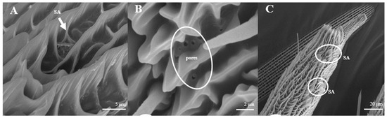 Morphology of sensilla basiconica in L. dispar. (A) s. basiconica I (×5000); (B) s. basiconica II of males (×5000); (C) s. basiconica II of females (×10,000).