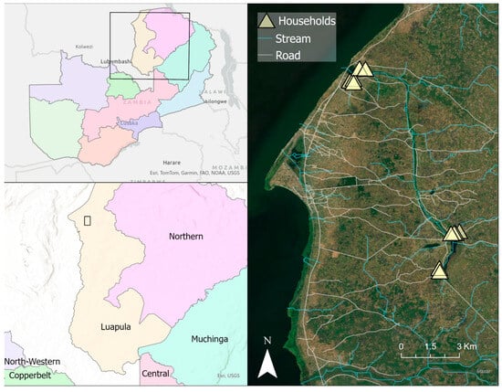 Map illustrating the location of the study site in Luapula Province in northern Zambia, set on the eastern shore of Lake Mweru. Top left panel; rectangle illustrating regional location of study area in Zambia. Lower left panel; rectangle illustrating study area in Luapula Province detailed in right panel. Triangles in right panel show the relative location of “lakeside” (upper) and “inland” (lower) household clusters. Map was generated with ArcGIS v10.6 (ESRI, ArcGIS, Redlands, CA, USA) using geocoordinates from study households [23]. Provincial border shapefiles were obtained from GRID3 Data Hub (https://data.grid3.org/datasets/d27357c640394f11943316e36cebaba3_0/about (accessed on 15 August 2024)).