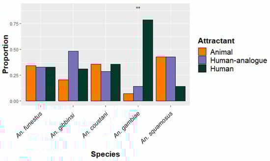 Species-specific proportion of specimens collected in traps among the three different schemes. Equal distribution among attractants would be expected if attractants had no impact on species-specific abundance. The five most abundant species are shown. ** Proportions statistically significantly deviate (p < 0.01) from the expected 1/3 in each attractant condition.