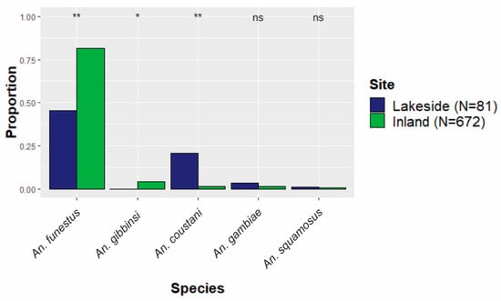 The proportion of each species relative to the total collections either inland or lakeside. The five most abundant species are shown. ** Statistically significant difference (p < 0.01) between lakeside and inland proportions. * Moderate difference (p < 0.1). ns indicates no statistically significant difference.