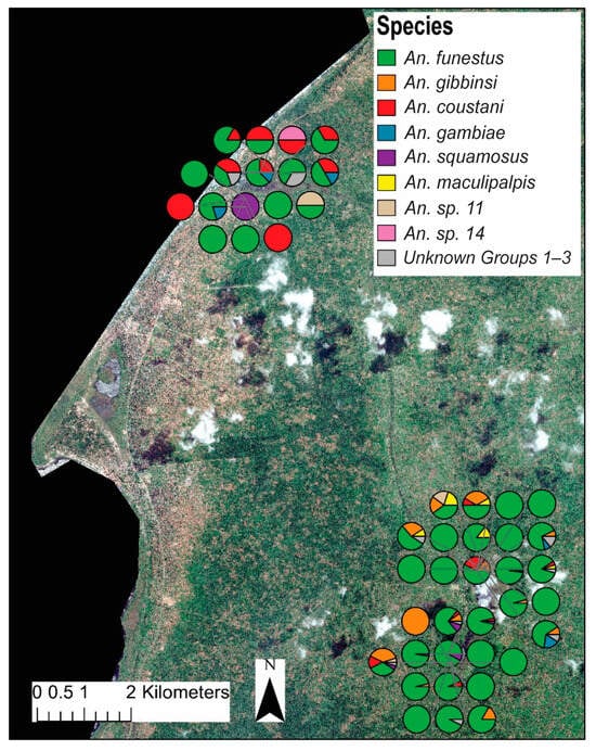 Map showing relative household/trap location and proportion of each species to total female anophelines collected per trap. The upper cluster of traps are classified as “lakeside” while the lower are considered “inland”. Map was generated with ArcGIS v10.6 (ESRI, ArcGIS, Redlands, CA, USA) using geocoordinates from study households [23].