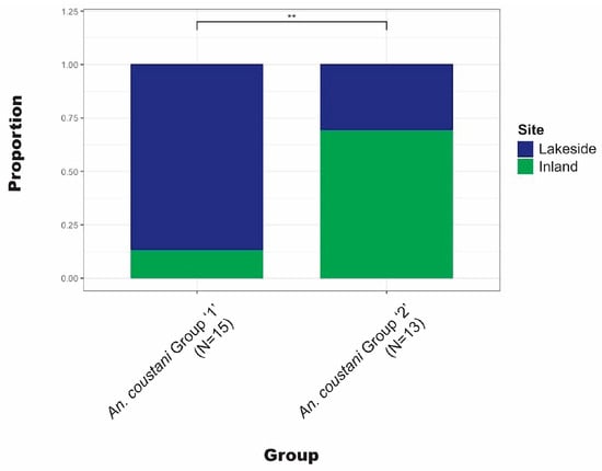 Anopheles coustani Laveran comprised a higher proportion of lakeside collections than inland. The complex clade structure of An. coustani has been explored elsewhere [30]. Ciubotariu et al. (2020) identified two distinct phylogenetic groups among An. coustani samples. Figure 5 illustrates that there is a statistically significant difference between the proportions of groups 1 and 2 found inland versus lakeside.
