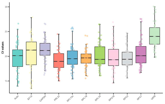 qPCR, which is usually used to determine gene expression levels, is a widely recognized, established method that serves as a gold standard in molecular biology research [32,33,34]. Normalization is essential in qRT-PCR analysis for addressing variations that occur within and between reaction cycles. These variations can lead to inconsistencies, including variations in the quantity of the initial sample material, differences in RNA integrity, discrepancies in the loading amounts of cDNA among samples, and deviations in reverse transcription efficiency [35,36,37]. Thus, the observed reference gene variability encapsulates both the intrinsic variability of the gene itself and the technical errors incurred during the process [36]. Controlling all steps leading up to the PCR measurement is crucial, and selecting an appropriate reference gene is vital for achieving precision across varying experimental setups.