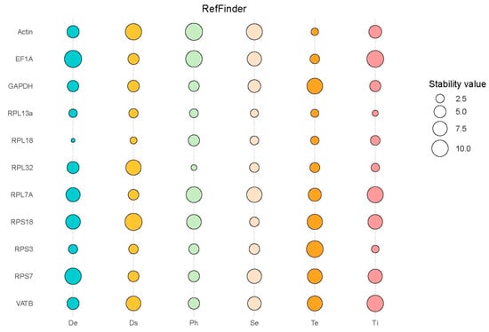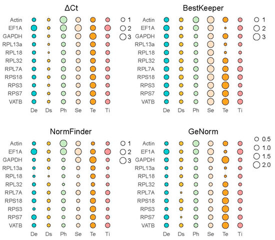 Stability of 11 candidate reference genes assessed using the ΔCt method, BestKeeper, NormFinder, and geNorm. The size of each bubble represents the reference gene stability value, with smaller bubbles indicating more stable genes. De: developmental stage, Ds: dsRNA treatment, Ph: photoperiod treatment, Se: sexes, Te: temperature, Ti: tissues.