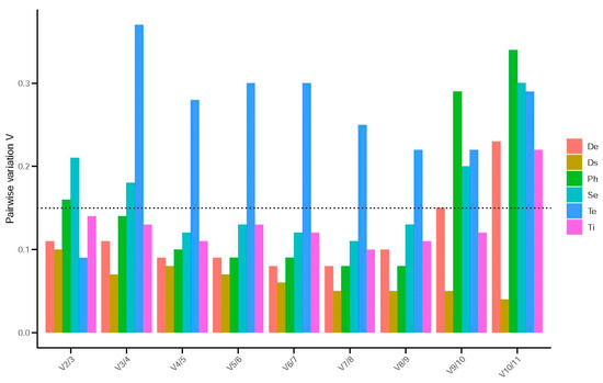 geNorm analysis of 11 reference genes in Holotrichia parallela determined the optimal number for accurate normalization. Pairwise variation (Vn/Vn+1) values indicate the stability of reference gene combinations. The dotted line represents the recommended threshold (0.15), below which additional reference genesare not necessary. De: developmental stage, Ds: dsRNA treatment, Ph: photoperiod treatment, Se: sexes, Te: temperature, Ti: tissues.