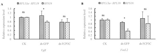 Expression of the target genes VgR (A) and FoxL2 (B) in Holotrichia parallela treated with RNA interference (RNAi) using different reference genes. *: a statistically significant difference with p < 0.05; ns: not significant.